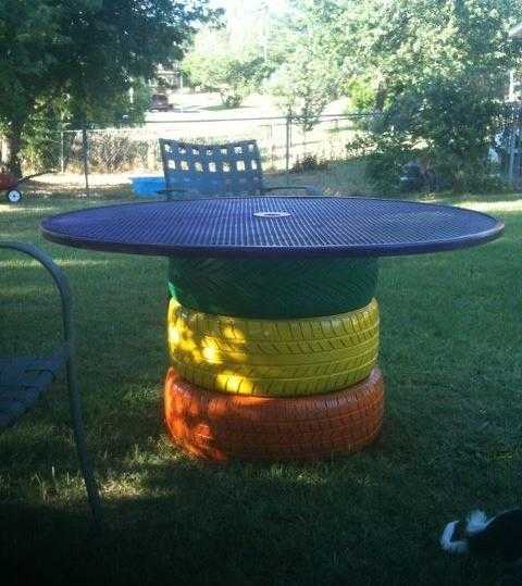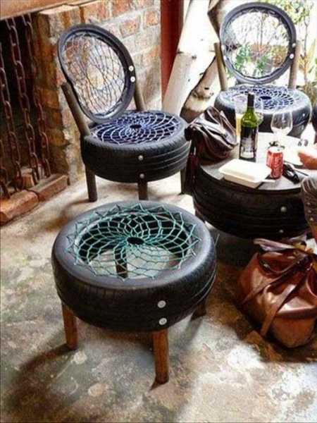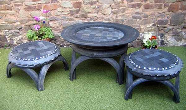Садовая и дачная мебель. Из шин, которые можно использовать вторично, можно изготовить прекрасные дачные столы и кресла, обеденные комплекты и полноценные гарнитуры.
