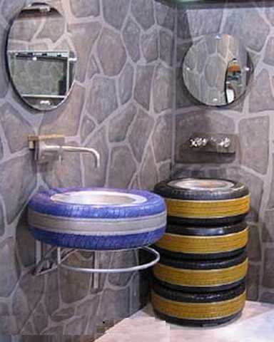 Пластичной и гибкой авторезине по силам любые метаморфозы. Дождевая вода с крыши будет стекать по мягким нержавеющим желобам, вырезанным из шин, а стены гаража или мастерской украсят удобные полукруглые полки, куда можно складывать мелкие вещи и инструменты.