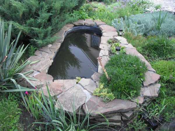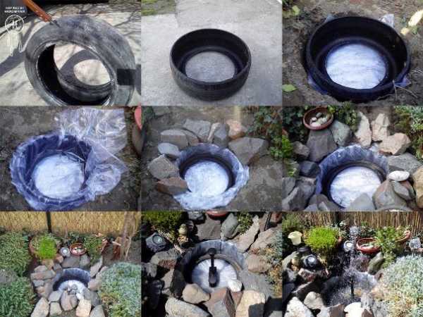 Великолепная идея для создания садового прудика. Выкапывается яма по размеру покрышки, последняя застилается плотной пленкой, внутрь опускается шланг с водой. По краям покрышка маскируется всевозможными плоскими камнями, высаживаются влаголюбивые растения. В завершении прудик наполняется водой. Весь процесс создания такого прудика можно изучить на фото ниже.