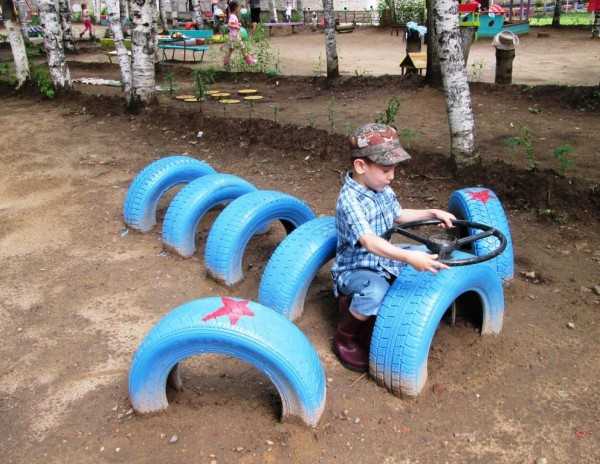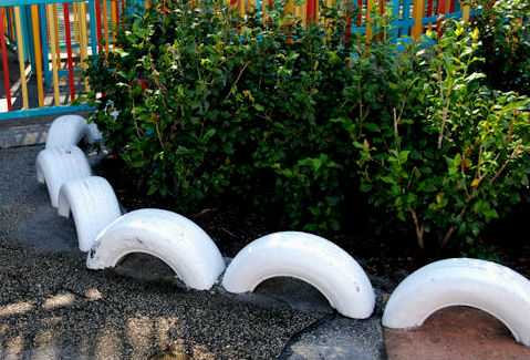 Можно обустроить целую детскую площадку из старых покрышек: ограждение для игровой, гимнастический снаряд для лазанья, прыганья и ползанья, подвесные качели, песочницу, даже мини-бассейн для игр в жаркую погоду — все это несложно соорудить за выходные все из тех же старых шин. А если вертикально вкопать в землю несколько покрышек подряд, получится удобная велосипедная парковка.