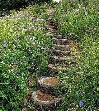Порой участок находится не на ровной поверхности, а уходит под склоном вниз, так вот чтобы не заморачиваться с бетонированием, можно использовать ненужные шины, закопав их по отвесному склону, формируя ступеньки.