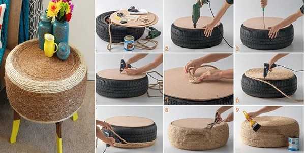 Очень стильно смотрится пуфик из покрышки, декорированный канатом. К поверхности шины прибивается фанера по размеру самой шины, затем берется канат и при помощи клея приклеивается к боковым и верхней части будущего пуфика. Весь процесс создания пуфика представлен на фото ниже.