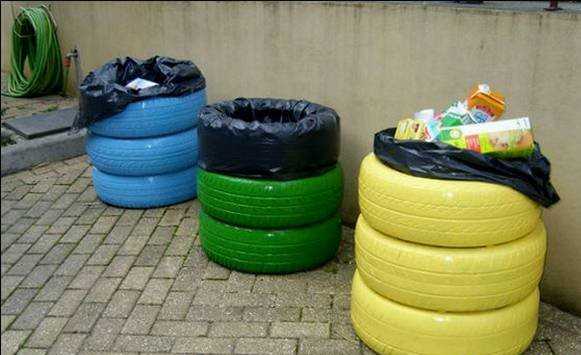 Простейшая в воплощении идея – уложенные друг на друга три или четыре покрышки, внутри большой мусорный пакет, а в итоге отличный мусорный бак. Покрашенные колеса будут смотреться более интересно и аккуратно.
