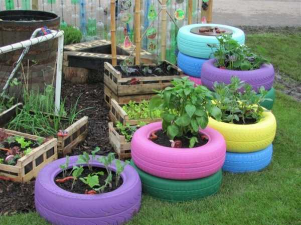 Вазоны удобно использовать и для выращивания зелени, например петрушки, укропа, лука. «Резиновые грядки» не только украсят дачный участок, но и будут, благодаря своей черной поверхности, намного быстрее прогреваться весной и давать урожай раньше. Из шин разных диаметров можно устроить многоярусную клумбу или грядку. Внизу уложить большую грузовую шину, затем, наполнив ее плодородной землей, установить на ней покрышку меньшего диаметра, выше -еще меньшего. Цветы или зелень высадить в промежутки между стенками.