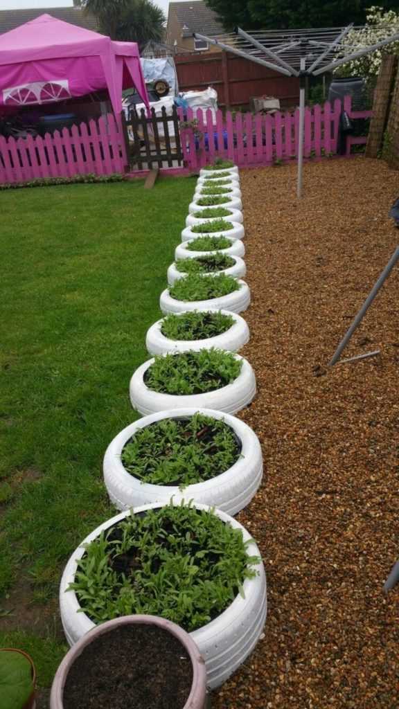 Классика жанра, традиционно старыми шинами отделяют зону от дорожки до клумбы или лужайки. Разрезаем покрышку пополам и закапываем отрезанной частью в землю. Такие бордюры по желанию можно покрасить в любой оттенок или проявив творческий подход – нарисовать цветы, машинки и т.д.