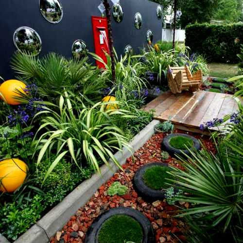 Использование декоративных инсталляций или функциональных изделий из шин помогает реализовать на территории сада или рядом с домом гармоничный проект дизайнерского оформления и обустройства.