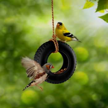 Колесо на канате, привязанное к ветви дерева с насыпанным кормом послужит отличной кормушкой для птиц.