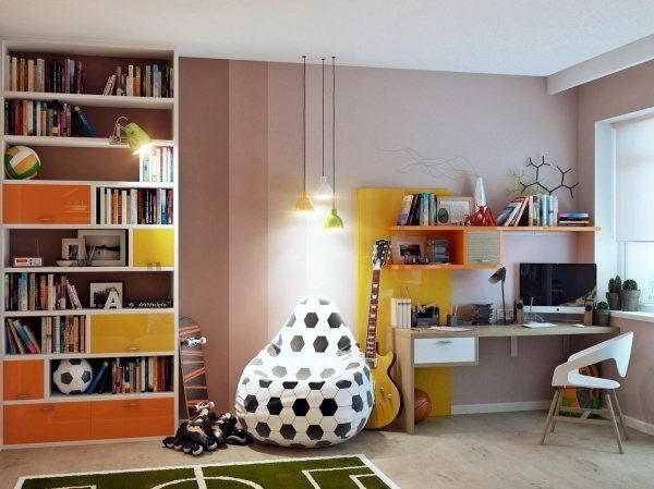 - Место для отдыха и творчества. Организация этой части спальни индивидуальна в каждом конкретном случае, поскольку каждый подросток увлекается чем-то своим и область интересов двух мальчишек 14 лет может пролегать в диаметрально противоположных плоскостях – например, футбол и музыка. Спортсмену следует оборудовать комфортный и продуманный спортивный уголок со шведской стенкой и компактными тренажерами, музыканту выделить место для инструмента и оборудовать небольшую сцену для импровизированных концертов, а художнику создать свободное пространство для творчества без ограничений – мольберт, многочисленные ящики и полки для красок, панель для демонстрации получившихся шедевров.