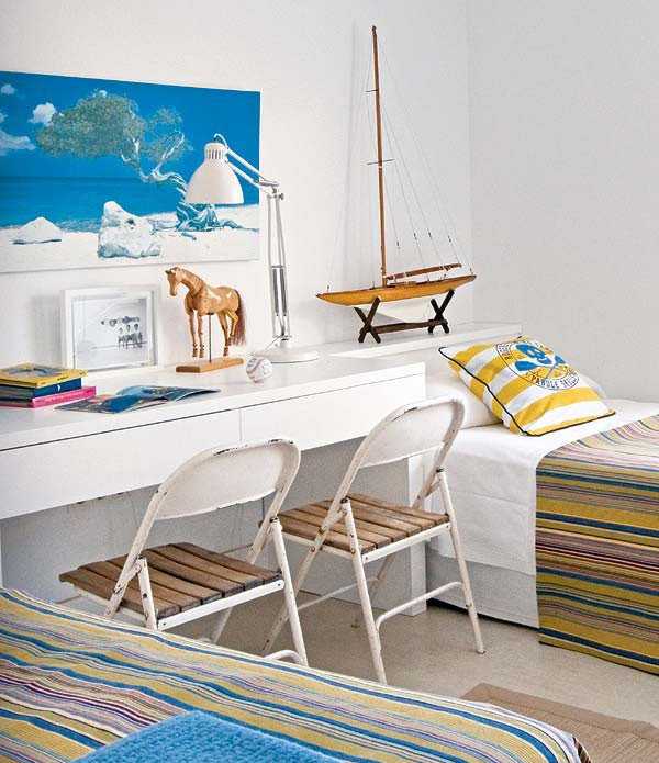 Интерьер можно стилизовать под тематику увлечений его хозяина. Например, в морском стиле – голубые или синие обои, легкие воздушные шторы, кровать, застеленная плотной холщовой тканью. Можно добавить немного песочных оттенков, аксессуаров по теме, ракушек и самодельный корабль – и вот готовая реализация дизайнерского решения. В этом плане комната для подростка – прекрасное поле для воплощения фантазий в жизнь.