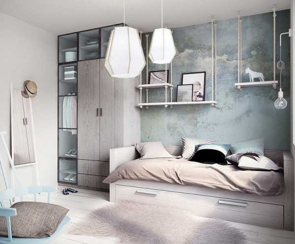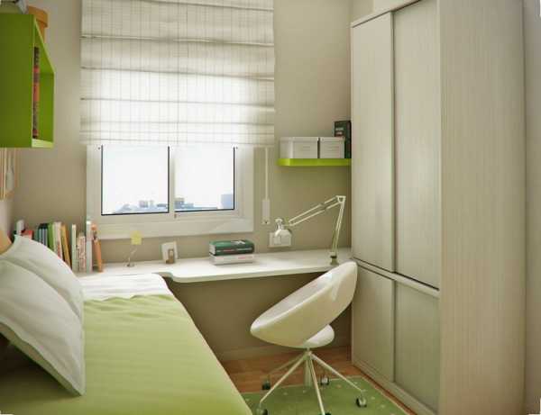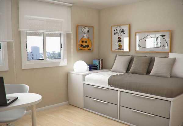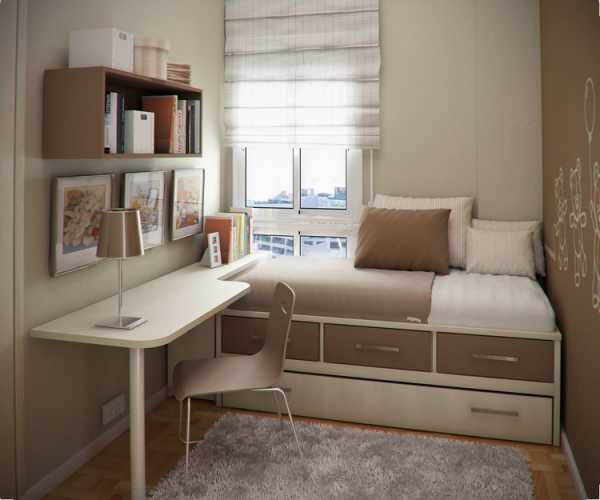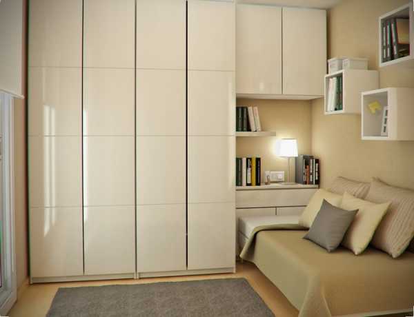 Несколько сложнее обстоят дела с планировкой в маленькой комнате. Ограниченное пространство будет причиной определенных сложностей с выбором отделки, мебели и планировки комнаты. В маленькой спальне чрезвычайно сложно выделить полноценное место для сна, работы и отдыха. В таком случае возникает необходимость совмещать эти зоны на минимальном пространстве. Чаще всего рабочий и творческий уголок совмещают в одной части комнаты, используя модульные шкафы и выдвижные системы хранения.