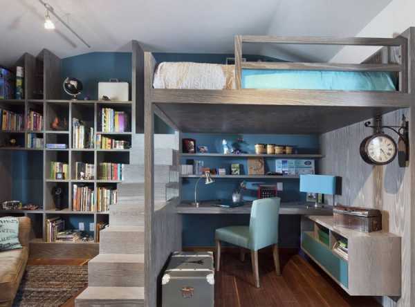 - Место для сна не должно занимать много места и мешать активной деятельности. Кровать-чердак или откидное спальное место станет отличным вариантом для спальни подростка.