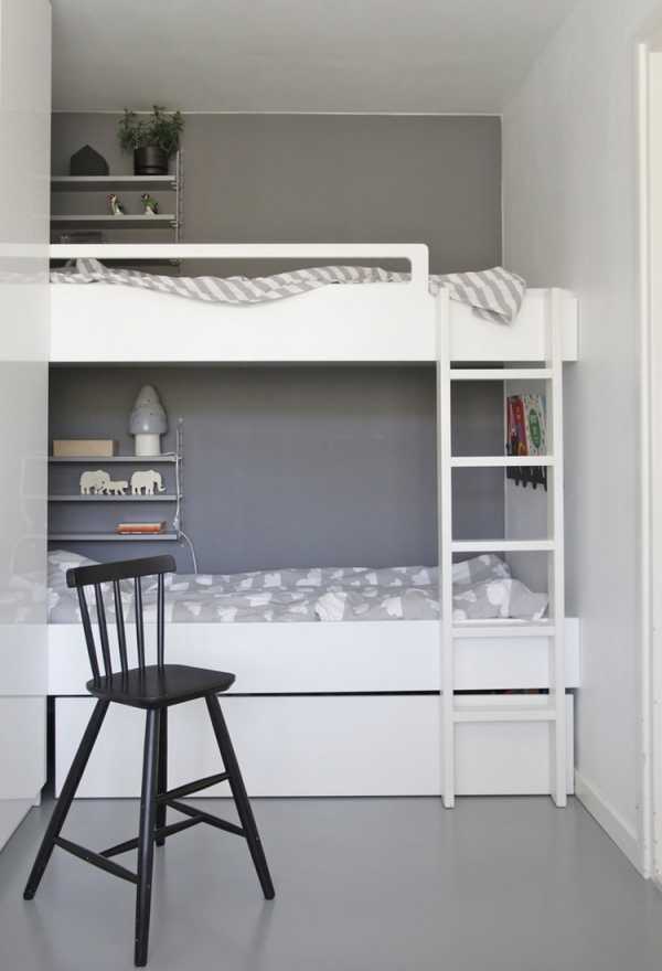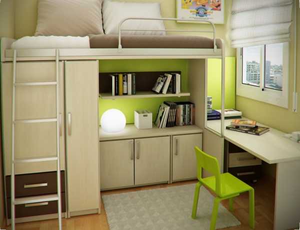 Если вы решите приобрести двухъярусную кровать, используйте пространство ниже. Создайте место для хранения вещей или обустройте место для чтения книг, обучения или отдыха. Некоторые производители мебели предлагают уже готовые решения, которые объединяют в себе шкаф и стол, размещенный под кроватью. Стоит отметить, что такие двухъярусные кровати можно использовать только с определенного возраста.