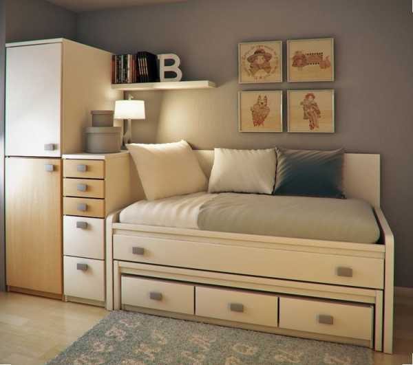 - Кровать. Она должна быть просторной и удобной. Выдвижные ящики сэкономят место и организуют пространство. Кровать можно заменить на диван-кровать, который легко разобрать на ночь.