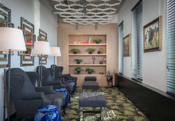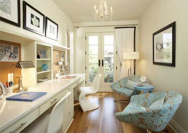 Еще один способ добавить женственные нотки в рабочее пространство — сочетание успокаивающих нюансов с естественным освещением. Этот длинный и узкий кабинет с двумя рабочими зонами был достаточно просторен для того, чтобы разместить два кресла: отличный способ добавить комфорт и стиль в пространство, которое вы так часто используете.