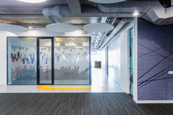 Офисы сотрудников разделены прозрачными перегородками. С одной стороны, это позволяет изолироваться от других сотрудников во время выполнения своих обязанностей, а с другой – дает возможность постоянно чувствовать себя частью большого и дружного коллектива. Прозрачные перегородки украшены матовыми рисунками, что является привычным элементом уличного искусства.