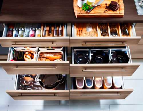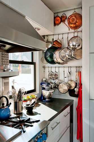 Для того чтобы можно было в нужный момент найти необходимую сковороду или кастрюлю они должны храниться в конкретном месте. Это также касается ножей и других предметов, которые часто используются при приготовлении еды. Способы поддерживать порядок на кухне могут быть самые разные: