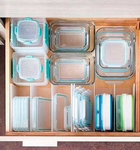 Для них необходимо оборудовать ящик примерно так, как на фото. Здесь они будут находиться рядом со своими крышками. Возможно, у вас их набор разных размеров. Тогда вставьте одни ёмкости в другие, чтобы они не занимали много места.