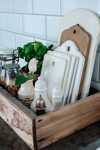 Сложите в деревянный ящик разделочные доски, специи и убирать рабочую поверхность станет легче.