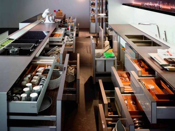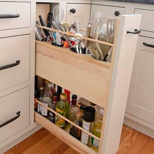 Рассмотрим комбинации ящиков и шкафов. Оптимальным вариантом будет совмещение лучших качеств ящичков и шкафчиков, как, например, эти глубокие полки, которые скользят вместе с открытием дверки.