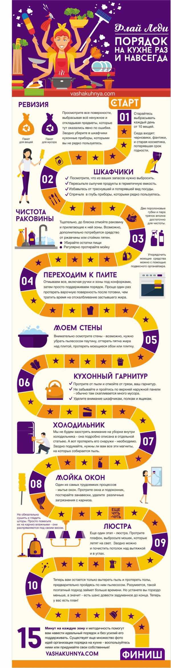Далее мы опишем пошагово, что нужно делать, чтобы навести порядок на кухне. Но, если вы не хотите всё это читать, то наглядно вся система «Флай леди» показана на следующей инфографике.