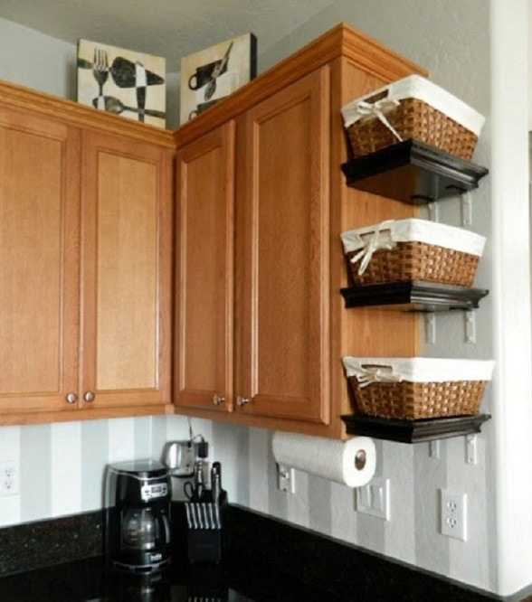 - Торцы шкафов помогут организовать систему хранения санитарных приборов: веника, швабры, моющих средств. Особенно хороши для такой идеи высокие торцевые шкафы, часто расположенные рядом с холодильником. В верхней части ставим полки для моющих средств, внизу – крючки для швабры и прочего. Также на торцы можно повесить кармашки для хранения, которые можно сшитьиз мягкой сетки своими руками. В них вы сможете держать полотенца и бумажные пакеты.