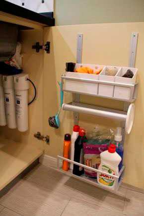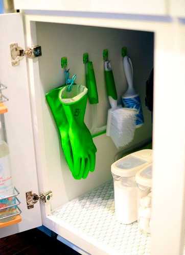 Обратите внимание на самую грязную зону любой кухне — раковину и ее окрестности. Для поддержания чистоты достаточно две поролоновые губки и пара небольших тряпок — остальное выбросите. Заодно замените старые — они больше вымазывают, чем чистят. Продумайте, как лучше упорядочить моющие средства — возможно, вам понравится подвесной органайзер.