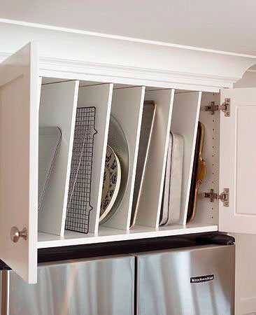 Посмотрите это видео по темеПротивни и подносы удобно хранить в верхних шкафчиках, если расположить в них вертикальные разделители.