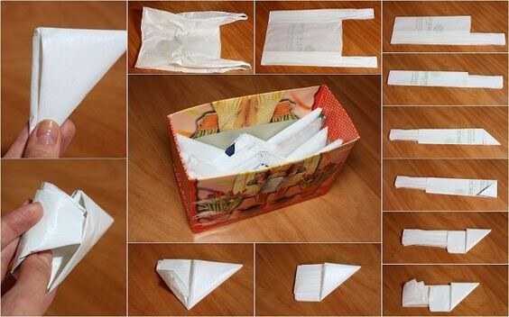 Данный способ поможет организовать хранение в прямоугольной салфетнице с дыркой сверху. Необходимо положить, расправить пакет, сложить его пополам вертикально. Далее надо взяться за основание и начать его закручивать трубочкой до ручек. Затем на ручки сверху кладется другой расправленный и сложенный пакет и закручивается.