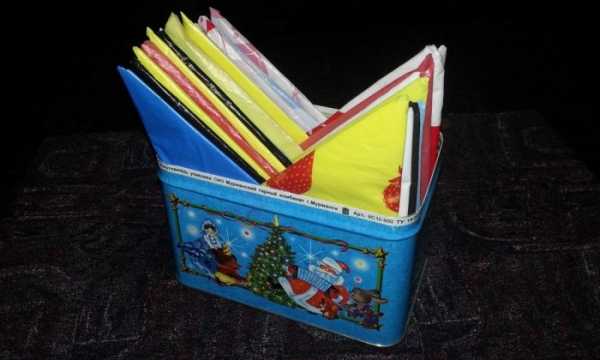 - Компактная подарочная коробка есть в каждой квартире, в неё поместится много не скреплённых между собой пакетов, если предварительно их сложить в аккуратные прямоугольники. В крышке коробки вырезается круглое отверстие. Оно позволит доставать по необходимости сложенные кульки. Коробка легко помещается в нижнюю кухонную тумбу, её можно поставить и на столешницу, такой предметного места нигде не займёт.