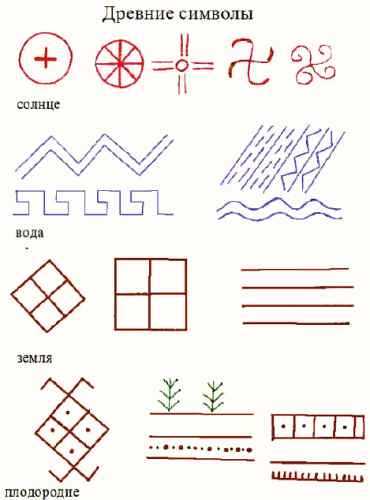 - круг, внутри которого звездочка, — солнце и другие небесные светила и т.д.