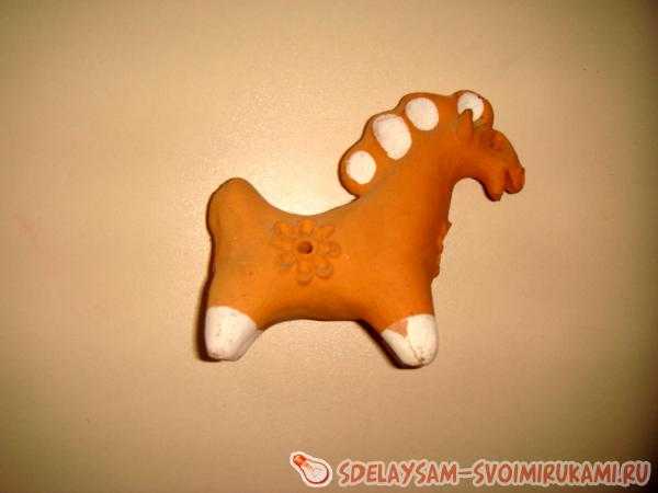 Для игрушки использовали нежирную, но пластичную глину «синику», которая после обжига приобретала белый цвет. Уникальная по своим свойствам глина, позволяла мастерице всю скульптурку лепить из одного куска, добиваясь красивых по пластике, выразительных форм.