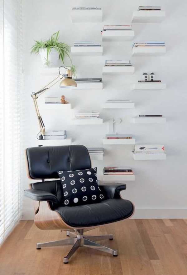 Идеальный вариант для тех, кто хочет зонировать помещение — навесные полки Ikea. Во-первых, они многофункциональны. А во-вторых, при творческом подходе к монтажу, имеют множество вариантов размещения на стене и дают возможность создать интересные композиции. Любителям экспериментов стоит дополнить это великолепие встроенной подсветкой — затраты минимальные, а эффект просто шикарный!