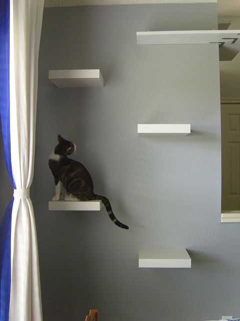 Полки ЛАКК – это классика в гостиных. Придайте им нужную форму, обрежьте, прикрепите к стенам. На полках можно хранить книги и сувениры, можно даже поставить на них бытовую технику или использовать их как фото-стенды, они реально крутые! Открытые полки являются лучшим способом для хранения и любования, в то же время это экономит пространство и выглядит легко и воздушно. А если между полками сделать переходы – то ваши кошки будут в восторге!