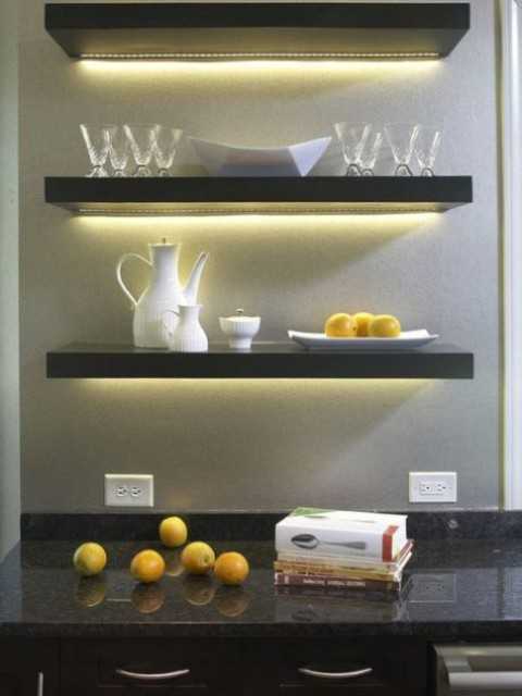 Открытые полки для кухни – это очень удобно. Если вы до сих пор не пользовались ими, возможно, стоит попробовать. Чтобы изготовить такие полки, можно использовать специальные крепления от Ikea с покрытием, гармонирующим по цвету и текстуре с кухонным оборудованием. Закрепите между креплениями деревянные планки нужного размера – и ваши полочки готовы! (Найдено на lemonthistle).