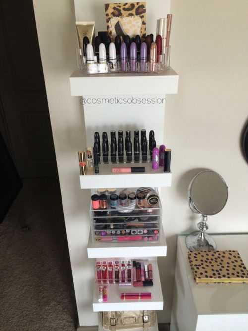 А можно превратить полки ЛАКК в настоящие хранилища красоты. Угловые полки по бокам от зеркала – идеально для кремов и макияжа. Две длинные полки и маленькие между ними – отличная идея для хранения косметики.