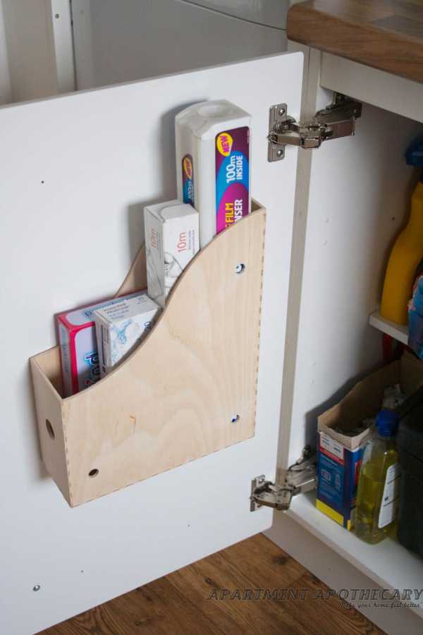 Чтобы максимально увеличить количество места для хранения кухонной утвари в кухонных шкафчиках, особенно в тех, что под раковиной для мытья посуды, можно использовать подставки для хранения журналов Knuff от Ikea. Просто закрепите одну из подставок на двери кухонного шкафчика – и в ней можно будет хранить все, что угодно. (Найдено на apartmentapothecary).