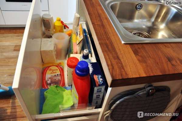 Прямо под мойкой в верхнем шкафу хранится бытовая химия, губки, пакеты и прочее хозяйство. Это очень удобно. И не мозолит глаз, всё спрятано.