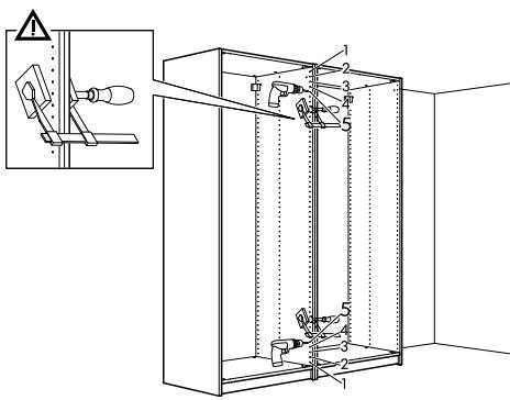 По схеме сборка мебели Икеа, шкаф Пакс крепится к стене помещения – так предусмотрел производитель Икеа. Это связано не только с безопасностью, но и для плавного движения дверей и плотного прилегания задней стенки шкафа к стене квартиры. Если по каким-то причинам отказались от присверливания, замените гвозди саморезами.