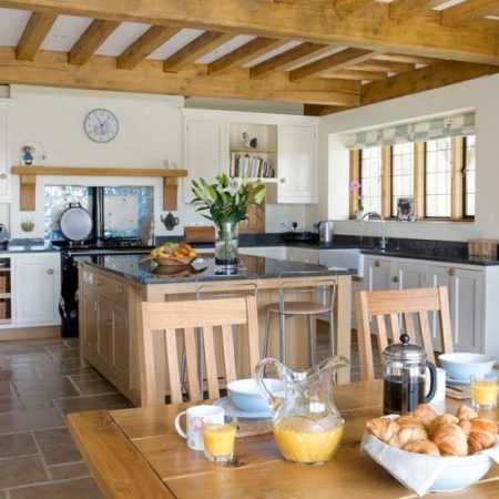 - Потолок должен также остаться максимально простым и деревенским. Для этого его белят и оставляют деревянные балки открытыми.