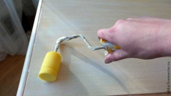 Итак, стол был зачищен, отшлифован и готов к декору. Далее, для экономии времени, постараюсь изложить кратенько последовательность работ. После тщательной шлифовки столешницу загрунтовала акриловым грунтом.