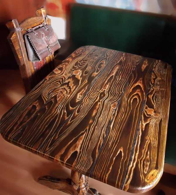 Битумный лак наносила не на всю столешницу сразу, а на две-три «доски», после чего стёркой делала рисунок. Далее опять наносила битум для следующих «досок» и опять делала рисунок, и так доска за доской, пока не разрисовала весь стол.