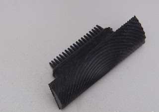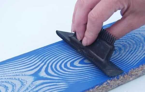 Основной процесс. Перед фладрованием необходимо подготовить ту вещь, с которой будем работать: необходимо ее тщательно очистить, отполировать мелкой наждачной бумагой и покрасить краской, которая будет основой - она потом будет имитировать рисунок дерева. Очень важно, чтобы поверхность была абсолютно гладкой, чтобы резиновая стерка при нанесении рисунка хорошо скользила и ни за что не цеплялась. На нижний, основательно высохший слой нанесем другослой краски, которую тут же будем стирать резиновой щеткой.Покачивающими движениями стерки создадим рисунок, имитирующий узел от ветки, движением стерки по одной грани создадим имитацию структуры дерева без узла от ветки. Стерку после каждого движения следует очистить, чтобы остатки краски не испортили рисунок. Для фладрования используем краски на водной основе (которые используем в интерьере - потому что они сухие и не пахнут). Для верхнего слоя можно воспользоваться глазурью оттенка, темнее чем нижний слой. Мастера добавляют к глазури пиво, чтобы краски лучше держались, а после того, как основательно высохнет, покроют двумя слоями бесцветного лака. Инструменты для фладрования. Техника работы со стеркой. 1. Узкой стороной стерки можно сделать ровные неглубокие канавки. Это делается на краях изделия, куда не войдет весь рисунок.