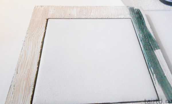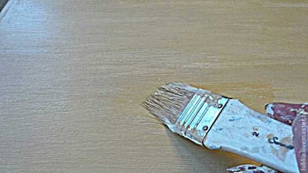 Приступаем к многослойному окрашиванию (состариванию поверхности). Плоской синтетической кистью наносим «Акрил-Хобби Де Люкс» Пеньковый. Не дожидаясь высыхания тряпкой (бумажным полотенцем) вытираем краску в тех местах, где хотим добиться состаривания. Просушиваем.
