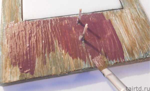 Следующий на очереди «Акрил-Хобби Де Люкс» ;Ежевичный (можно чуть смешать с красным и развести водой), наносим кистью и стираем, не дожидаясь полного высыхания краски. Просушиваем.
