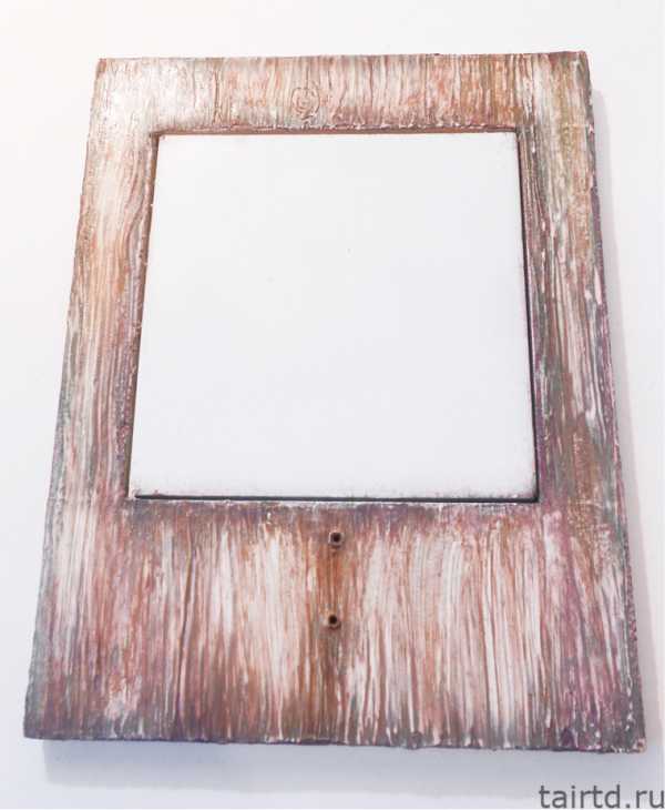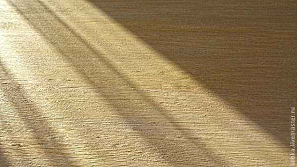 Приступаем к имитации деревянной поверхности, наносим плоской кистью акриловую рельефную пасту (тонкую) и, не дожидаясь высыхания, проходимся с лёгким нажимом плоской кистью (щетина), делая поверхность неравномерной.