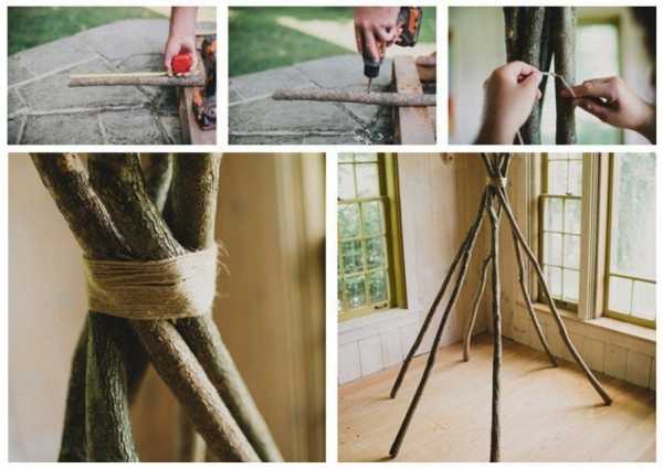 Можно соорудить и «вигвам на скорую руку». Для этого подойдут раскидистые ветви ближайшего дерева, на которые подвешиваем за середину простынь, закрепляем на ветках, а на углы заранее привязываем брусочки (или обматываем скотчем) и вкапываем их в землю. Все, вигвам готов! Но этот вариант подойдет больше для уличного оформления дня рождения.