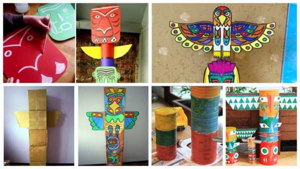 Для изготовления домашнего тотема вам пригодятся тубусы от бумаги, различного диаметра пластиковые трубы, возможно найдете толстые брусочки дерева. Высота и количество тотемов зависит от количества найденных подручных средств, из которых эти тотемы и будут изготавливаться. Принцип изготовления примерно тот же, что и уличных тотемов, за исключением их покраски –вместо этого основание (тубусы) тотемов можно обернуть и заклеить цветной бумагой. Расставляем их по комнате – и резервация нашего будущего племени приобретает яркие и реалистичные оттенки.