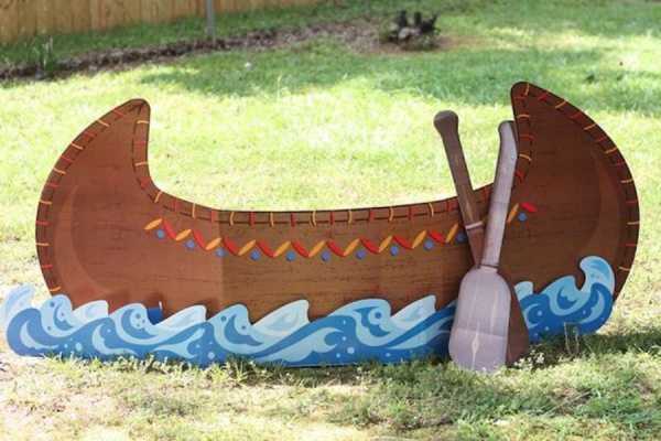 Каноэ сделанная своими руками из картона (ставшей ненужной, например, коробки из-под телевизора или других габаритных предметов), станет отличной фотозоной для целой резервации ваших маленьких индейцев. Украсить лодку можно различными орнаментами из цветной бумаги, простой росписью красок. Доверьте это задание имениннику, пусть его орнамент станет визитной карточкой племени.