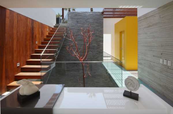 Камин выполнен в нарочито грубой манере, в духе старины. Пол на террасе выложен из каменной плитки вперемешку с крупными булыжниками. Смягчают интерьер деревянные стены дома и просторные окна. Воздух, вода, камень и дерево заряжают положительной энергией. Когда вы попадаете внутрь дома, это ощущение усиливается.