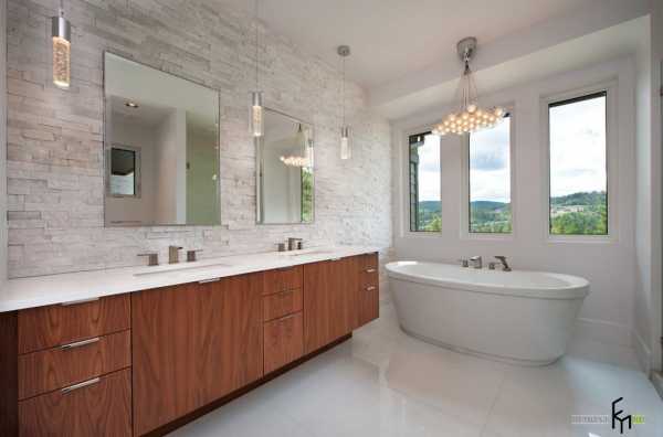 Белоснежная ванная комната со светло-кремовой каменной облицовкой смотрится невероятно современно, практично и просторно. Необычный дизайн светильников и минимализм в исполнении мебели придает комнате легкости и воздушности.